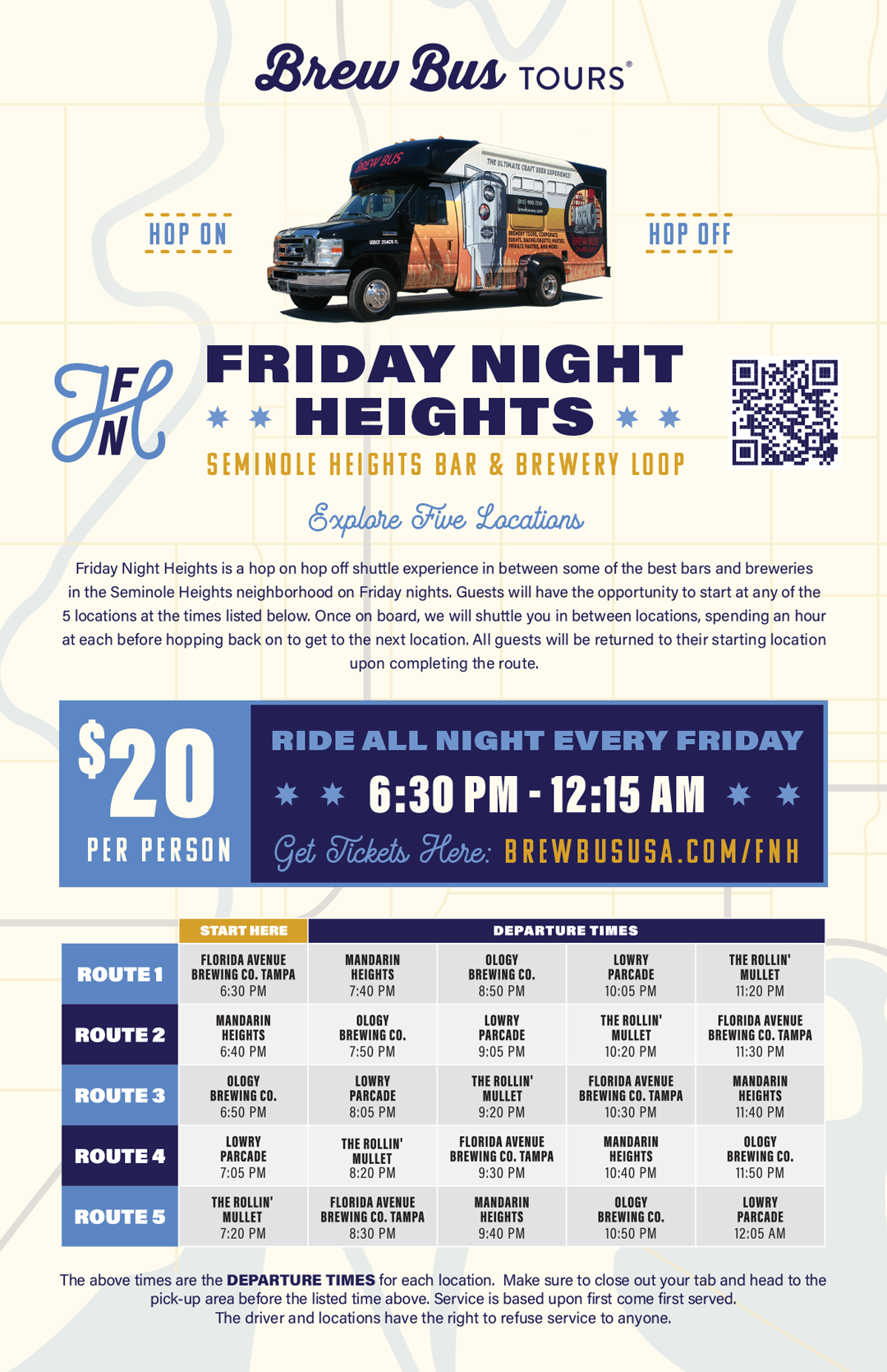 Friday Night Heights is a hop on hop off shuttle experience in between some of the best bars and breweries in the Seminole Heights neighborhood on Friday nights. Guests have the opportunity to start at any of the 5 locations at the times listed on the graphic to the right. Once on board, we will shuttle you in between locations, spending an hour at each before hopping back on to get to the next location.
