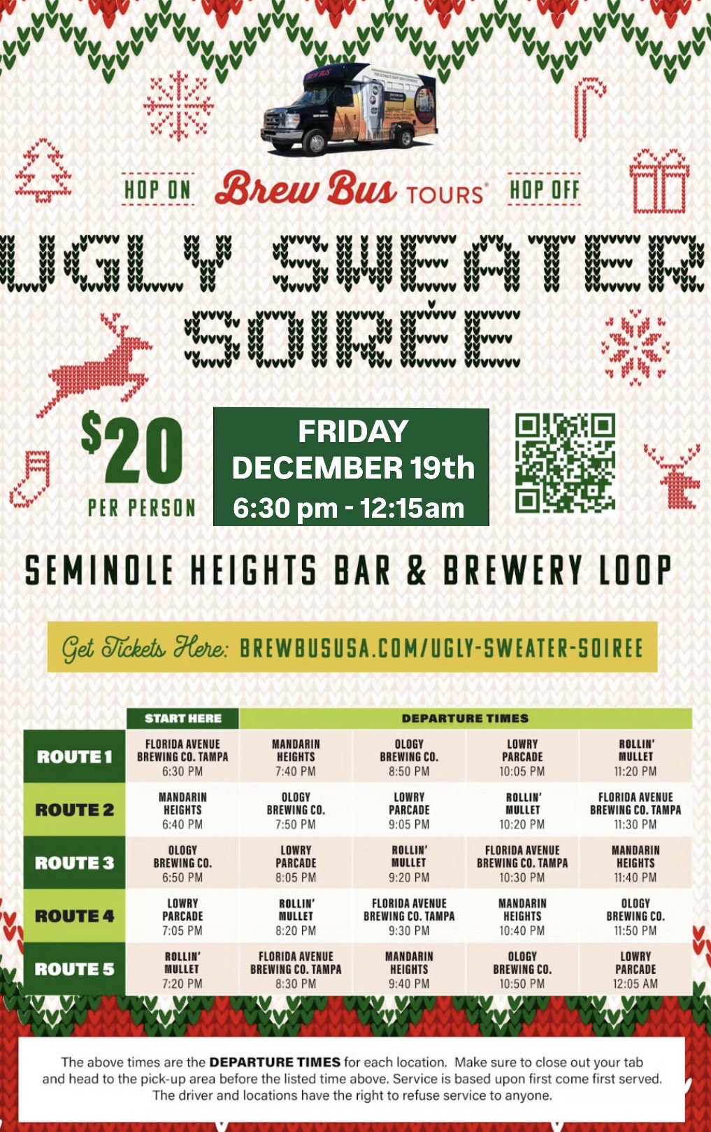 Ugly Sweater Soirée consists of our bus making a continuous loop around to all 5 locations. Tickets are $20 in advance and $25 day of the event!